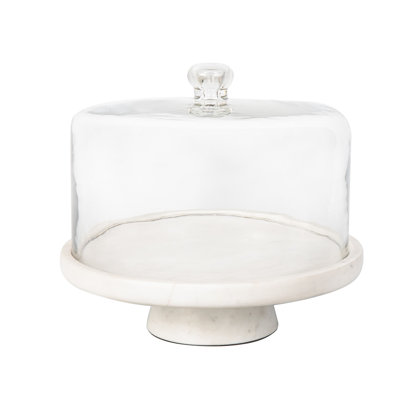 A mouth-blown glass cake stands with a small arched dome. Serve petits fours or small cakes in this little glass cake stand. A small mouth-blown glass cake stand and dome with a slim knob handle. Designed for small cakes or petits fours. Mouth-blown by skilled glassblowers to create a classic cake stand with a dome. The foot of the cakestand is shaped and applied by hand to the drawn stem while the glass is still malleable. The oval knob on the dome is shaped from molten glass and applied by hand. The rims of both are melted under a flame to achieve a soft, rounded finish.