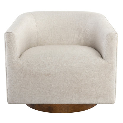 Introduce a chic, contemporary look into any setting with this accent chair featuring neutral beige upholstery, smooth swivel action, and a contrasting oak wood base.